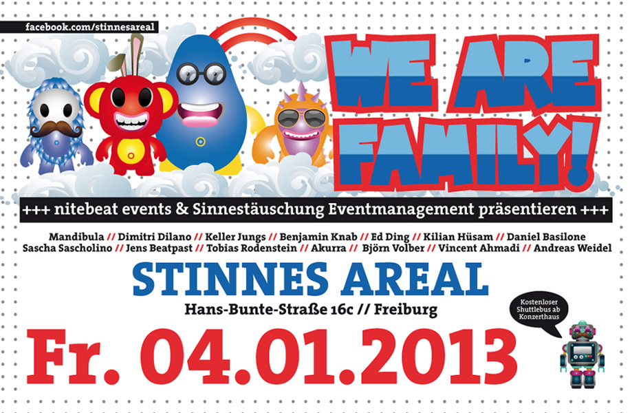 We Are Family begrüßt das neue Jahr um die frischen Tage artgerecht einzugrooven. Für den Transfer zur Location sorgt ein kostenloser Shuttlebus, der ab 22 Uhr im 30-Minuten-Takt ab dem Konzerthaus Freiburg verkehrt.
