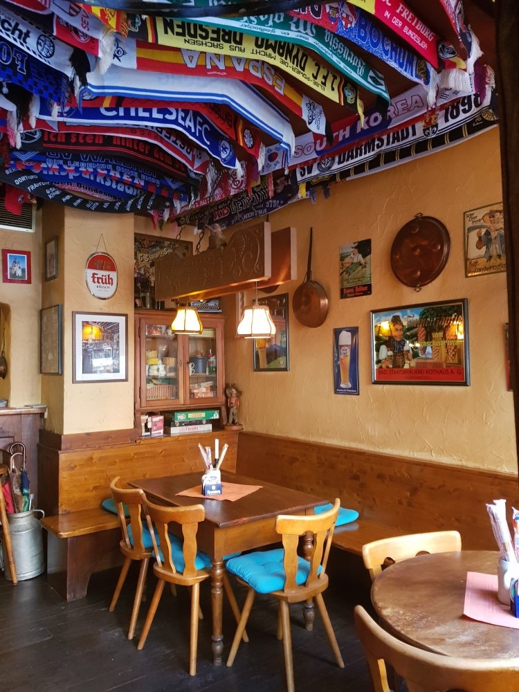 Montag bis Freitag ab 11 Uhr geöffnet. Samstag, Sonntag und an Feiertagen bereits ab 10 Uhr! Diverse Fassbiere, Kölsch und Weizenbier. Schorle natürlich. Bierstangen auch. Münzsprecher, gusseiserne Aschenbecher, Dart, Spielautomat und Fanschal-Galore. Zudem günstig, herzlich und gemütlich. Originaler geht Kneipe nicht!