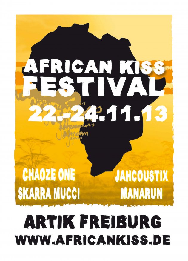 Die AIM.Jugend (African Information Movement e.V.) lädt vom 22. bis 24.November zum siebten African Kiss Festival ein. Drei Tage lang bietet man zusammen mit Viva Con Agua de Sankt Pauli e.V. in den Räumen des Freiburger ArTik ein umfangreiches Programm aus Kunst, Kultur und Musik. Der gesamte Erlös des Benefizfestivals fließt dabei in das AIM. Ausbildungszentrum in Komenda (Ghana) und in Trinkwasserprojekte von Viva Con Agua. Los geht’s am Freitag mit einer Vernissage des Hamburger Künstler-Duos strassenkoeter und einer Foto-Ausstellung. Am Abend sorgt der Mannheimer Rapper Chaoze One mit weiteren MCs und DJs für das musikalische Programm. Samstags gibt es ab 13 Uhr einen afrikanischen Markt mit Essen und Kunsthandwerk, sowie Workshops und einem Kinder-Café. Live treten ab 22 Uhr dann die Bands Manarun und Skarra Mucci auf. Am Sonntag wird eine Podiumsdiskussion zum Thema „Sinn und Unsinn der Entwicklungszusammenarbeit“ stattfinden, bevor Jahcoustix anschließend mit Reggae-Klänge unterhält. www.africankiss.de
