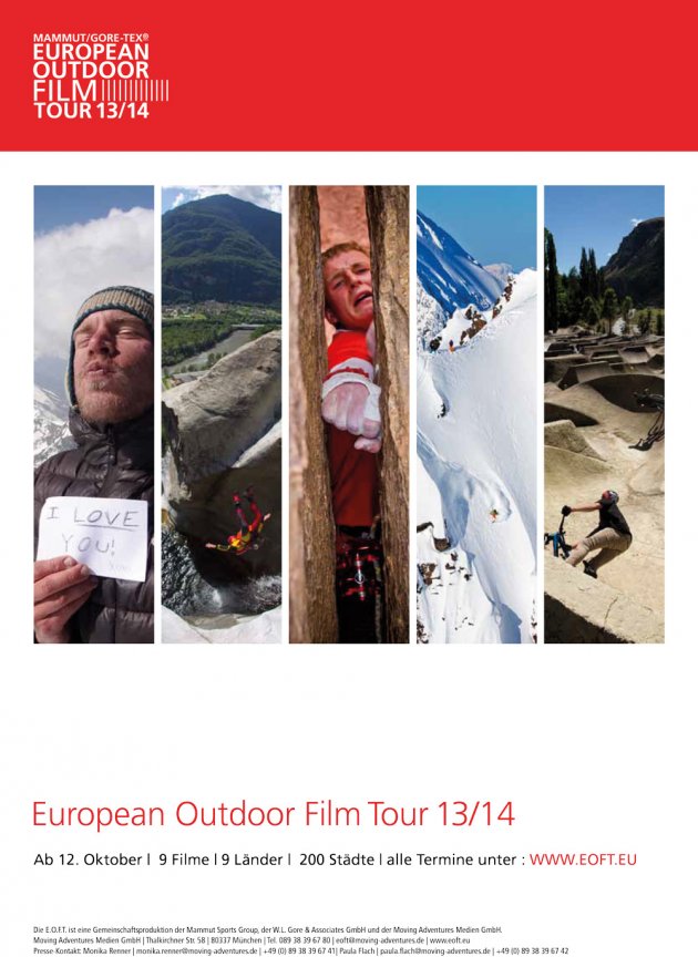 Wer ist hier der Künstler? Der Kajaker, der die perfekte Linie aus einem reißenden Wasserfall herauszulesen vermag - oder der Kameramann, der an einem dünnen Seil 30 Meter über dem Abgrund hängt und den richtigen Winkel für die perfekte Aufnahme sucht? Die Grenzen verschwimmen, Athleten werden zu Künstlern, Künstler zu Athleten. Die E.O.F.T. 13/14 zeigt in neun Kurzfilmen und Dokus den Nervenkitzel auf der Suche nach Extremen. Mit dabei sind die Streifen Wide Boyz (Klettern), North Of The Sun (Surf-/Umweltdoku), The Road From Karakol (Mountainbike-Roadtrip), Supervention (Ski & Snowboard), Cascada (Kajak), NotBad (Mountainbiking), The Beginning (Canyoning), Sound Of The Void (Steilwandskifahren) und Petit Bus Rouge (Basejumping & Highlining). Tickets gibt’s für 14 Euro. www.eoft.eu