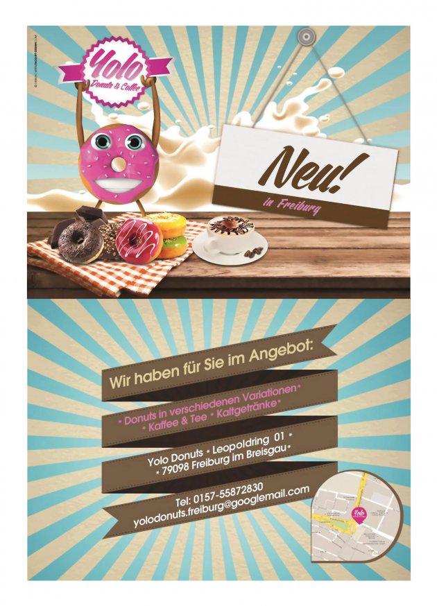 Im Dezember hat mit Yolo Freiburgs erster Donut-Laden eröffnet. Neben den mit Zucker überzogenen Krapfenkringeln gibt es hier auch Bagels - die meist herzhaft zubereitete Form ringrunder Backwaren. Korrespondierende Heißgetränke komplettieren das stimmige Sortiment. www.facebook.com/YoloDonutsFreiburg