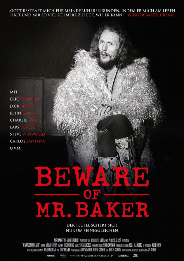 dem sein Vater während des zweiten Weltkrieges in den Tod fährt. Er schwört sich, niemals wieder auf der Strecke zu bleiben. Später wird er als der Teufelsschlagzeuger bekannt. Ruhm erlangt mit Bands wie „Cream“ und „Blind Faith“ führt er ein Leben in Extremen. Drogen, Frauen, Musik. Heute lebt der 73-jährige brachial-brillante Trommler mit seiner vierten Frau und 39 Polo-Ponys in Südafrika. Regisseur Jay Bulger hat dort mit ihm gelebt um die Basis für seine Dokumentation anzufertigen. Ergänzt mit Interviews von Kollegen wie Eric Clapton oder Carlos Santana und Berichten von Freunden, Ex-Frauen und einigen Kindern ergibt sich ein Abriss der beeindruckenden Lebensgeschichte des „besten Drummers der Welt“. www.bewareofmrbaker.com