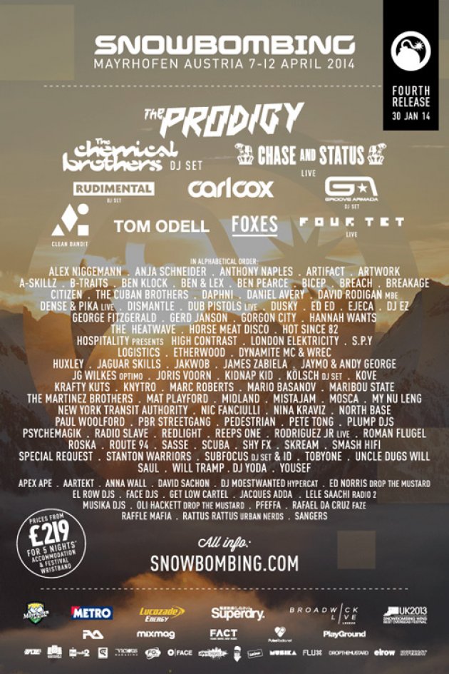 Im April belagert das Snowbombing mit seiner 15. Ausgabe das Skigebiet des Zillertals in Mayrhofen. Für das mächtige Programm sorgen dieses Mal u.a. The Prodigy, The Chemical Brothers, Carl Cox, Nic Fanciulli, Chase & Status, Groove Armada, Four Tet, Rudimental, Subfocus, Aartekt, Alex Niggemann, Anja Schneider und viele, viele mehr.