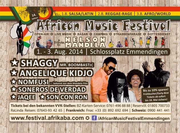 Das African Music Festival vereint jährlich afrikanische Kultur und Weltstars auf dem Emmendinger Schlossplatz. Dieses Jahr gastieren hier u.a. Shaggy, Angelique Kidjo und Soneros de Verdad feat. Mayito. Early-Bird-Sparfüchse aufgepasst: bis zum 18. Mai gibt’s beim Kauf der Eintrittskarten 10% Ermäßigung. www.afrikaba.de