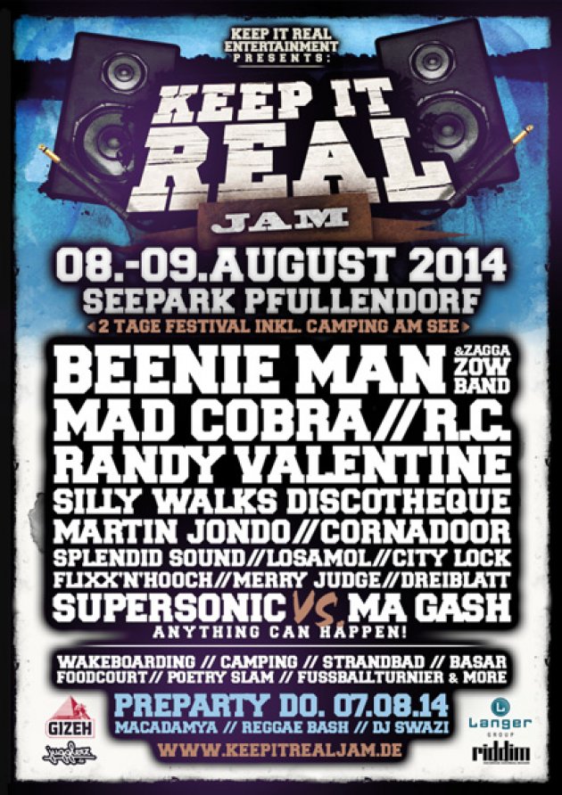 Bereits im dritten Jahr seines Bestehens befindet sich die Keep It Real Jam auf Expansionskurs. Zum ersten Mal gibt es bereits am Donnerstag eine kostenlose Pre-Party auf dem Gelände. Und auch das Line-Up lässt höchsten Zuspruch erwarten. Konkret: Beenie Man & Zagga Zaw Band, Martin Jondo, Mad Cobra, Randy Valentine, R.C., Supersonic Sound uvm. Tickets gibt’s im VVK für schlappe 30 Euro inkl. Camping. www.keepitrealjam.de