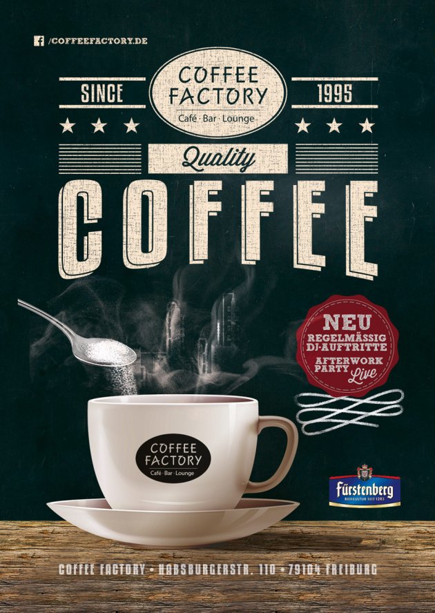 … nun mit nNeuemr Pächter, neuer Inneneinrichtung, High-End La Cimbali Kaffeemaschine und original italienischer Kaffee. Die Devise der Coffee Factory lautet also nach wie vor: Richtig guter Kaffee in allen Variationen, überdurchschnittliche Qualität zu fairen Preisen am Mittagstisch und dies ergänzt um ein umfangreiches Angebot an offenem Tee (inkl. BIO Bio und Detox). Kandiert wird das neue Gesamtpaket mit After-Work-Partys, DJ-Gigs, neuer Cocktailkarte und frischen Bierspezialitäten. Die konkreten Veranstaltungstermine gibt es zeitnah über Facebook. www.facebook.com/coffeefactory.de
