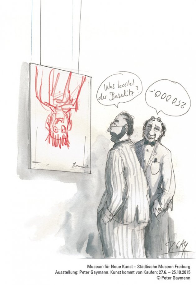 So gesehen ist diese Ausstellung ein doppeltes Jubiläum. Der Künstler feiert seinen 65. Geburtstag, das Museum sein 30-jähriges Bestehen. Die Schau zeigt zahlreiche Werke des Freiburger Cartoonisten, der sich mit Witz, Komik und Satire mit den Absurditäten des modernen Kunstmarktes auseinandersetzt.
