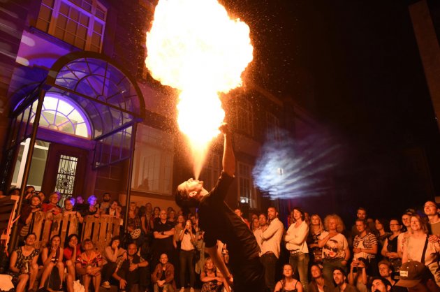 Artikelfoto: Museumsnacht, Feuershow im Innenhof des Museums für Neue Kunst © Städtische Museen Freiburg, Foto: Rita Eggstein