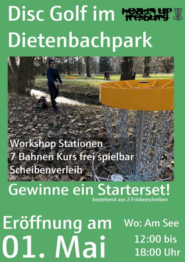 Disc Golf, in vielen skandinavischen Ländern bereits Trend, in Zentraleuropa eher unbekannt. Diesem Umstand hat sich nun der Freiburger Heads Up e.V. angenommen und im Dietenbachpark die erste öffentlich spielbare Disc Golf Anlage installiert.